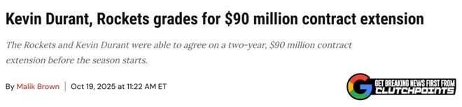 北京时间10月20日,杜兰特和火箭达成2年9000万美元的续约合同,比顶薪少拿3000万。知名美媒ClutchPoints对续约双方进行了评级。杜兰特现在多了两年的稳定合同,而火箭则锁定了这位有史以来最出色的得分手之一,希望他能帮助球队突破瓶颈,在季后赛中走得更远。以下是续约后对杜兰特和火箭的评级——